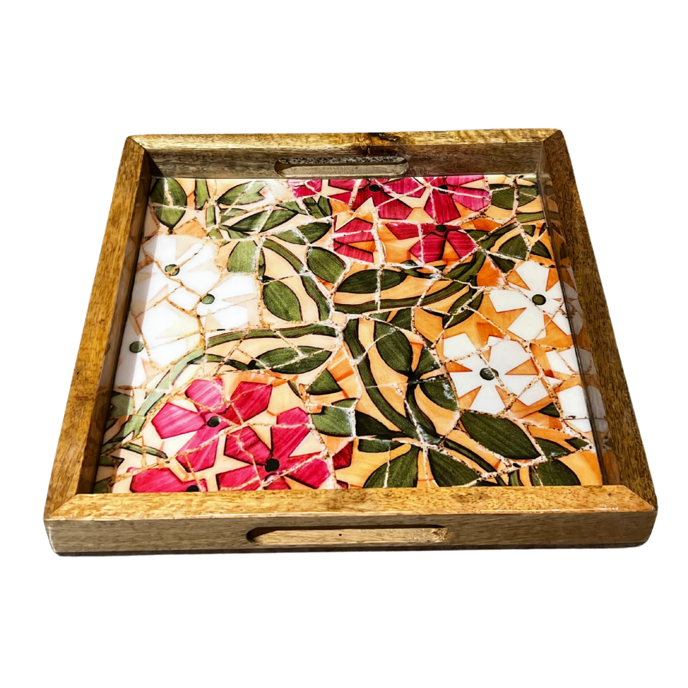 Featuring a vibrant mosaic bloom pattern inspired by nature, each tray is hand-poured with naturally dyed, toxin-free epoxy resin over locally sourced wood, ensuring a durable yet beautiful finish. This tray isn’t just visually striking; it is thoughtfully crafted to be eco-friendly, sustainable, cruelty-free, organic, and biodegradable—a true reflection of conscious living.