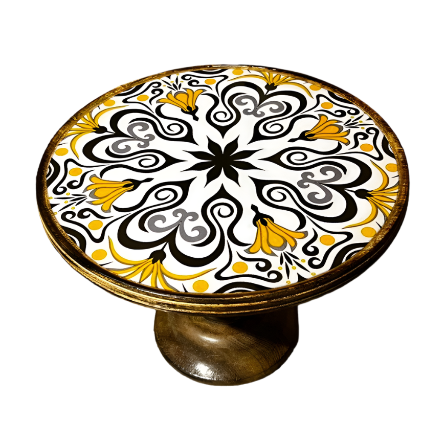 Unveil the timeless elegance of traditional Indian artistry with the Royal Mandala Wooden Cake Stand. Handcrafted in Saharanpur by master artisans, this exquisite piece brings together ancient woodcraft techniques and intricate epoxy resin artistry. The top is adorned with a vibrant black, grey, and gold mandala motif—a symbol of harmony, celebration, and sacred geometry—making this stand the centerpiece of any festive or conscious-luxury gathering.