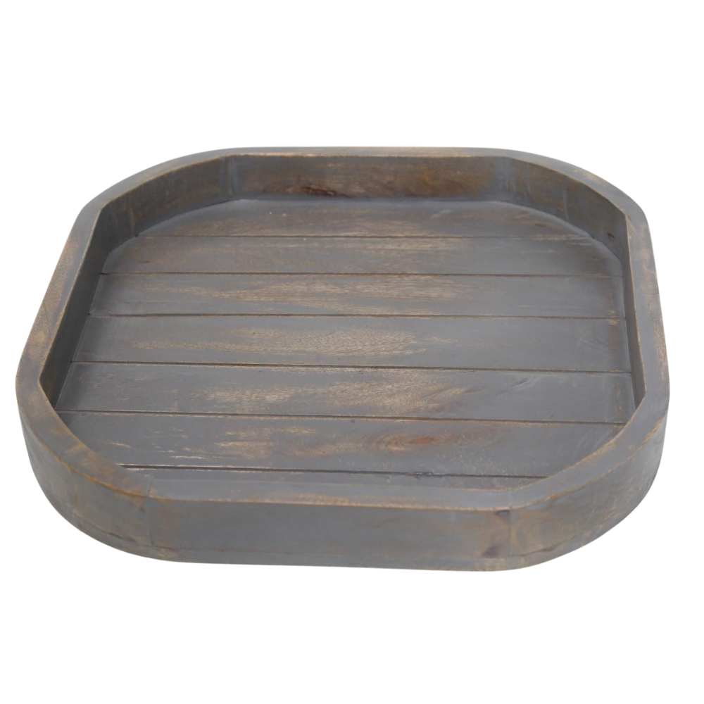 Each piece is expertly carved from sustainably harvested hardwood and hand-finished with a naturally aged, smoky wash using toxin-free, organic dyes, imparting it with a rich patina and rustic soul. The rounded square design, paneled base, and slightly raised edges offer both visual depth and practical durability.