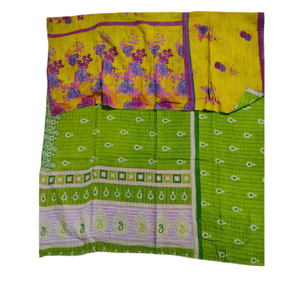 Each piece is a unique patchwork of history, color, and craft. Carefully sourced cotton saris—rich with past life and cultural significance—are layered and quilted using the ancient Kantha technique. The result is a lightweight, breathable, and visually captivating textile that embodies eco-conscious elegance and timeless Indian artistry.